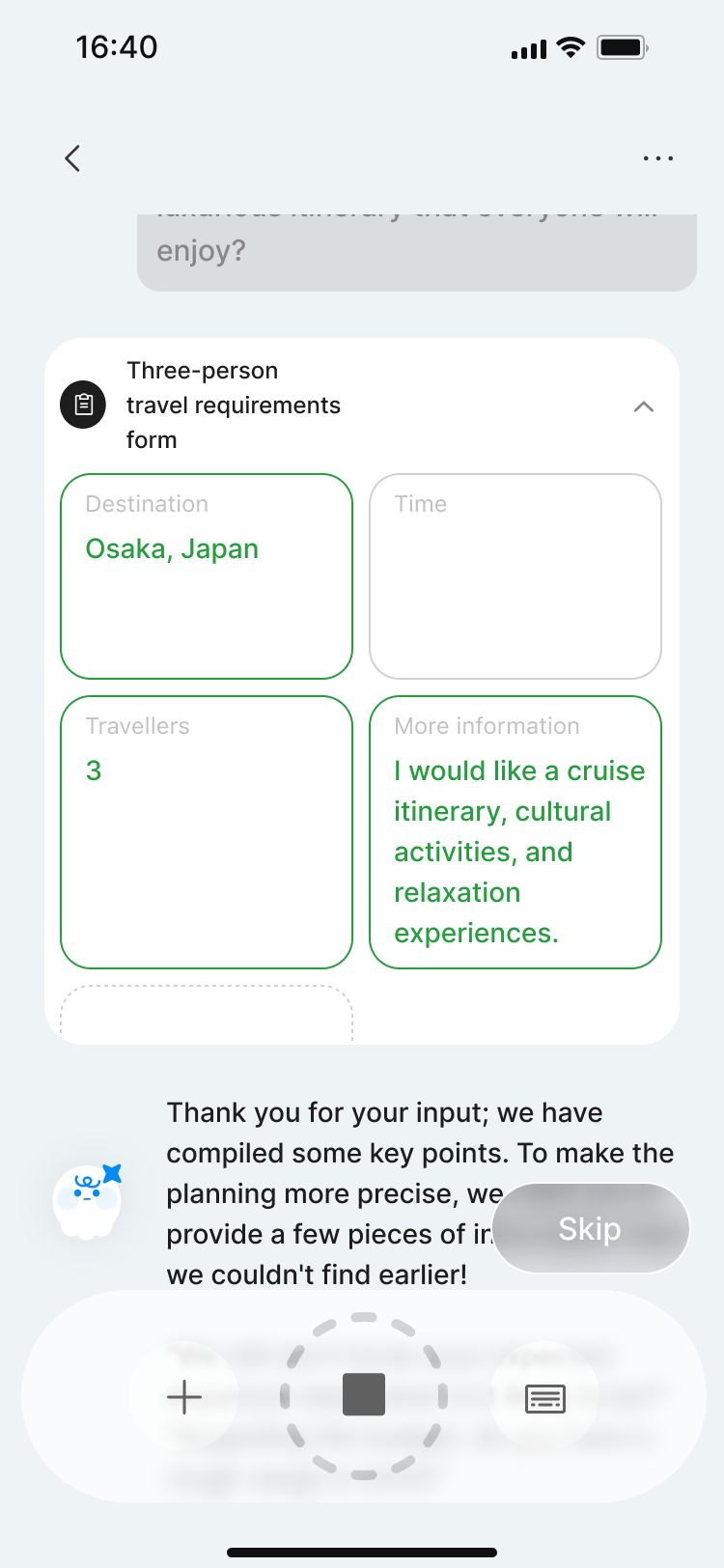 Enter your travel conditions — destination, duration, who's coming, what you love. One paragraph is enough.