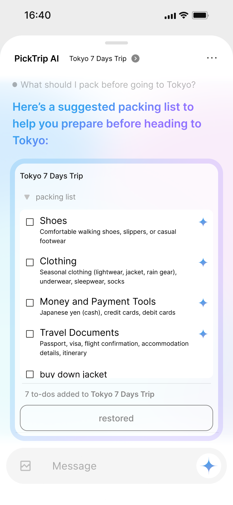 Your itinerary, activities, and the local forecast turn into a to-do list — so nothing gets left behind.