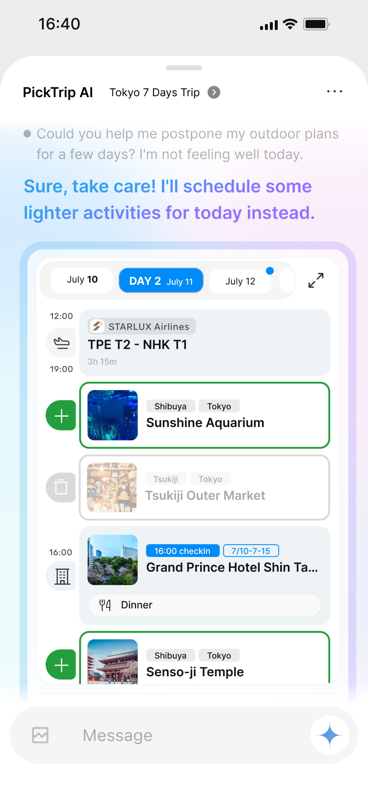 Feeling unwell? Crowded spot? Say it like you'd say it to a friend. PickTrip rebuilds everything around the edit.